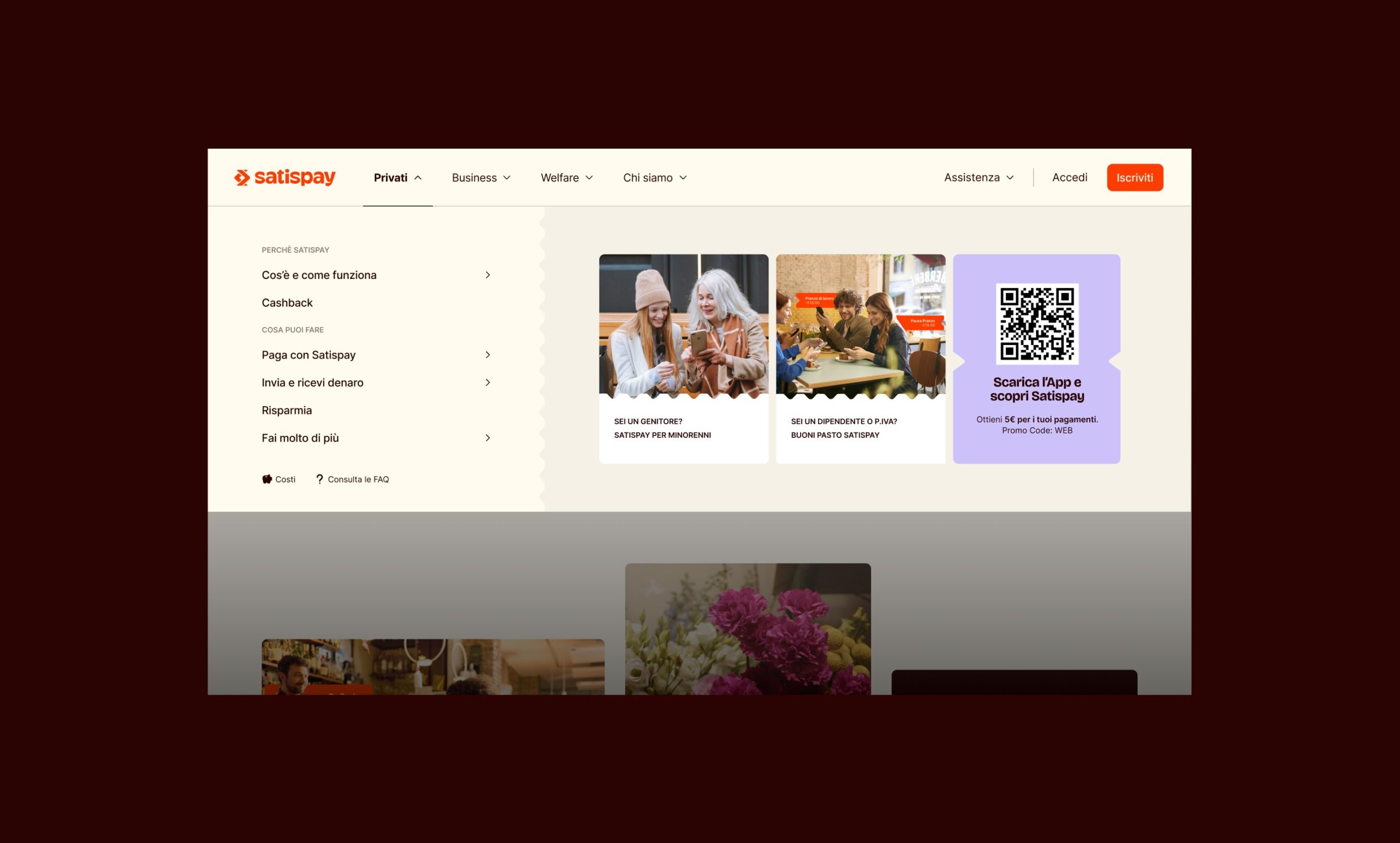 Il redesign del sito di Satispay ha le basi in un’architettura flessibile. Il menu di navigazione è progettato con una doppia gerarchia: prima per target, poi per azioni. Le persone accedono facilmente alle feature conosciute e possono scoprire quelle nuove, in modo fluido.